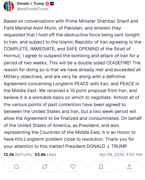 ট্রুথ সোশ্যালে দেওয়া এক পোস্টে প্রেসিডেন্ট ট্রাম্প লিখেছেন, “পাকিস্তানের প্রধানমন্ত্রী শেহবাজ শরিফ ও ফিল্ড মার্শাল আসিম মুনিরের সঙ্গে কথোপকথনের ভিত্তিতে, যেখানে তাঁরা আজ রাতে ইরানের ওপর ধ্বংসাত্মক শক্তি প্রয়োগ স্থগিত রাখার অনুরোধ জানিয়েছেন, এবং ইসলামিক রিপাবলিক অব ইরান যদি হরমুজ প্রণালি সম্পূর্ণ, তাৎক্ষণিক ও নিরাপদভাবে খুলে দেওয়ার বিষয়ে সম্মত হয়, তাহলে আমি ইরানের ওপর বোমা হামলা ও আক্রমণ দুই সপ্তাহের জন্য স্থগিত করতে সম্মত হচ্ছি। এটি হবে দ্বিপাক্ষিক যুদ্ধবিরতি!”